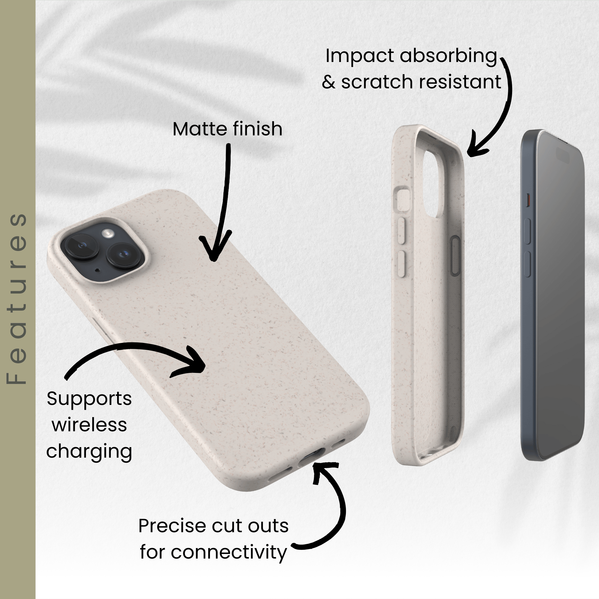 Our cases don’t just look good, they work hard too. Shock-absorbent, scratch-resistant, and with precision cut-outs for all your buttons and ports. Plus, they're wireless-charging compatible because sustainability shouldn’t slow you down.